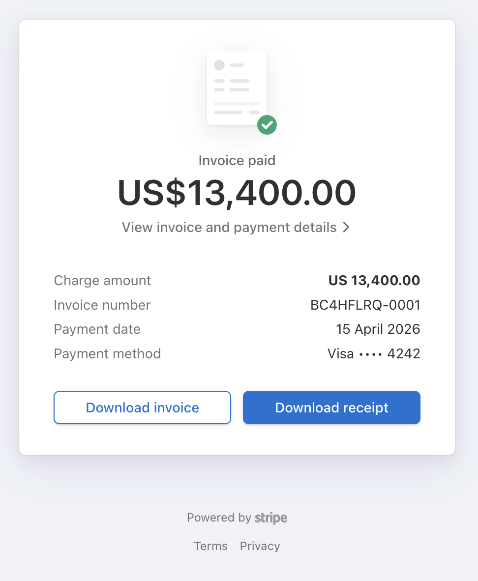 Auto-generate invoices from your contract. Clients pay directly from the invoice — no chasing required. Pre-authorized payment capture on signing.